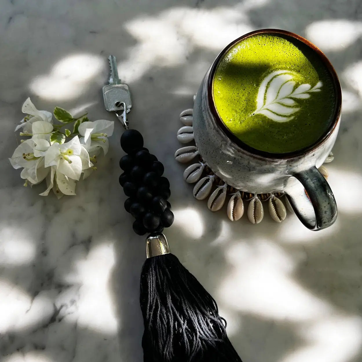 Hergestellt hauptsächlich aus Baumwolle und akzentuiert durch elegante schwarze Holzperlen, strahlt dieser Schlüsselanhänger eine raffinierte Anziehungskraft aus und verleiht Deinen täglichen Utensilien einen Hauch von eleganter Raffinesse.