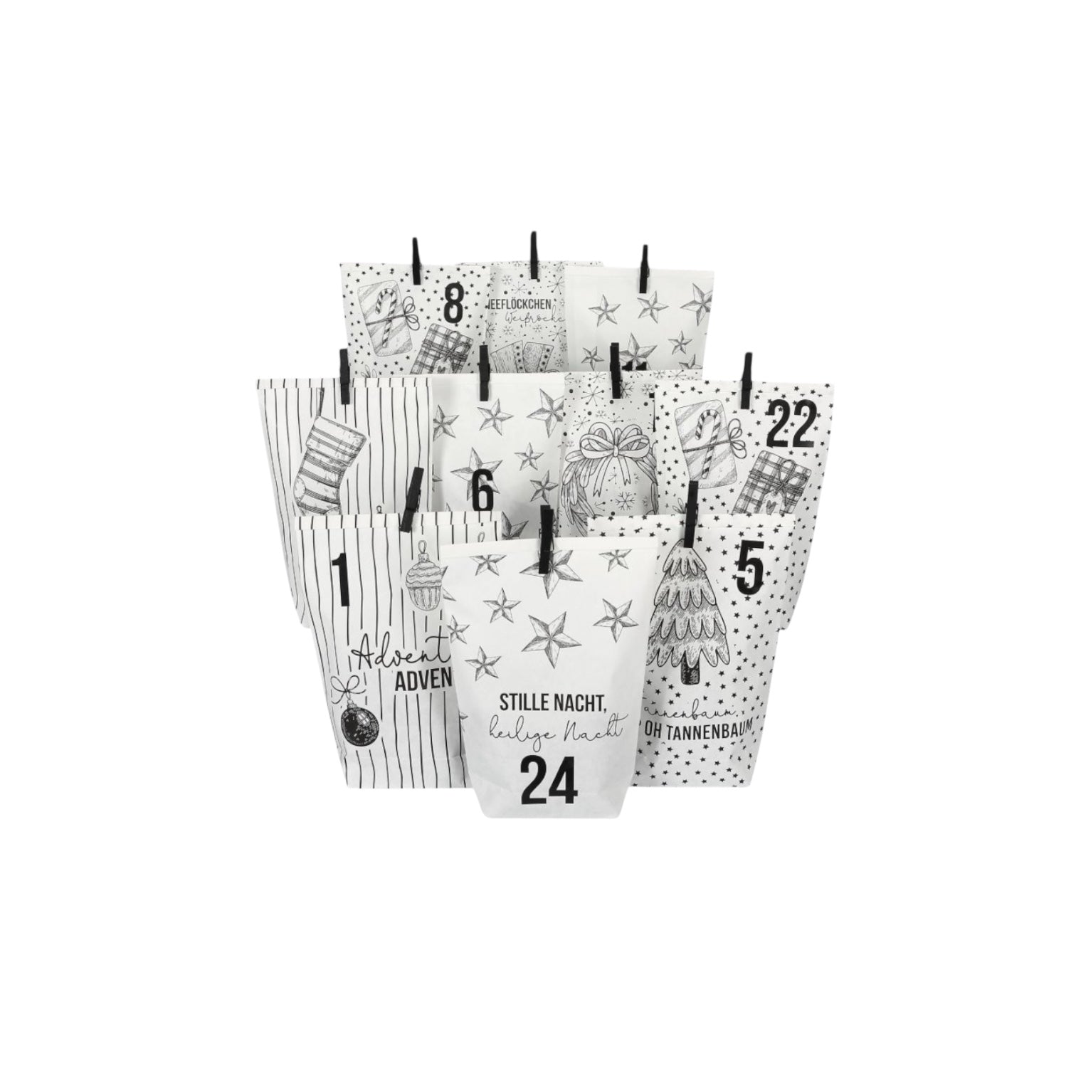 Kreiere deinen ganz persönlichen Weihnachtskalender. Du erhältst 24 schwarze und weiße Kraftpapiertüten mit tollem Druck (14x22cm) sowie 24 silberne Zahlenaufkleber. Damit wird jeder Adventskalender ein echter Hingucker. Nur noch befüllen musst du ihn selbst. Papiertüten, Zahlenaufkleber und Holzklammern sind enthalten, sodass der Bastelspaß sofort losgehen kann.