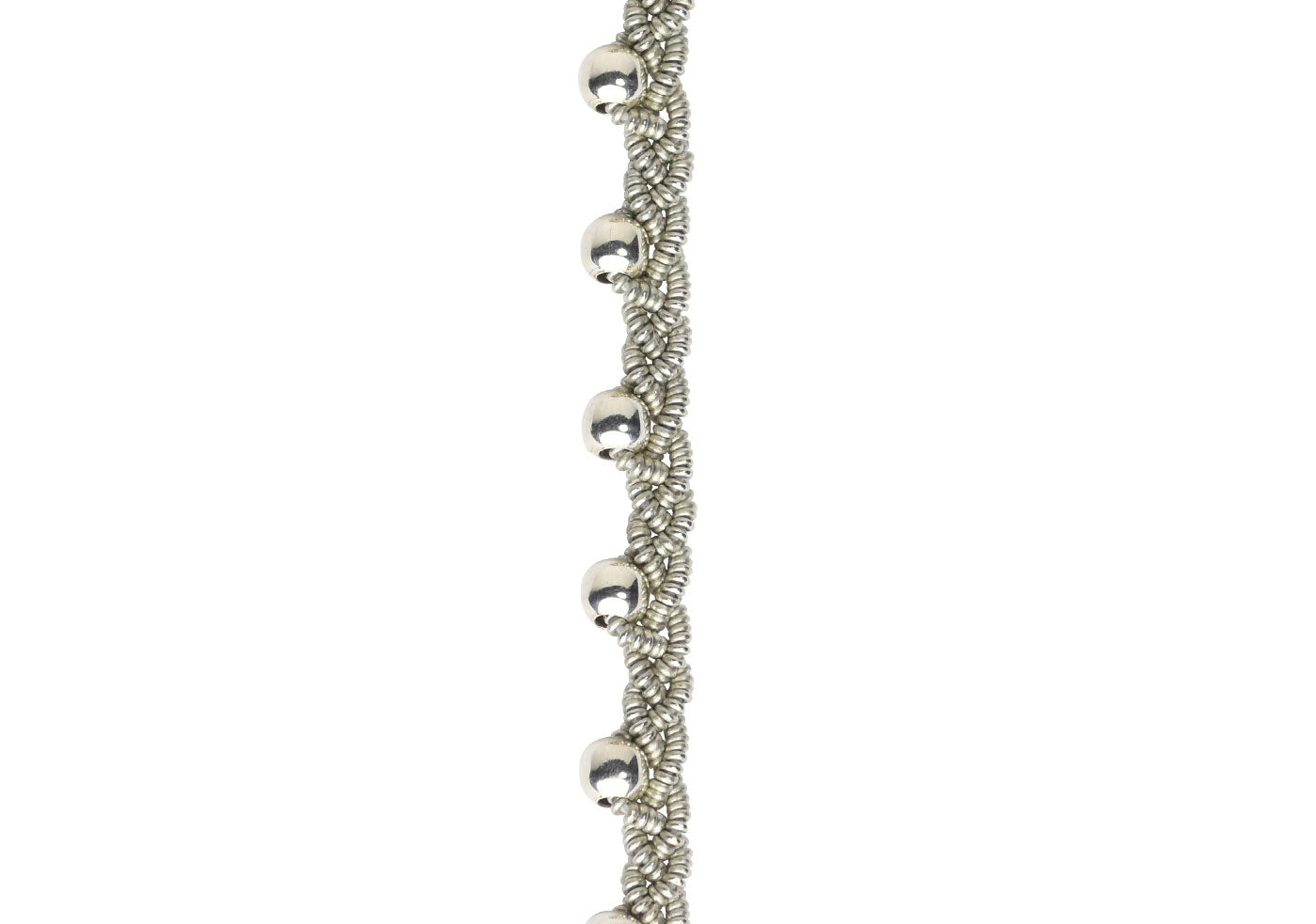 In asymmetrie geflochtenes sehr feines, ca. 0,5 cm breites Armband aus Zinnfaden und 2,5 mm großen Silberperlen. Nicht auf Leder aufgenäht – nur Lederenden.