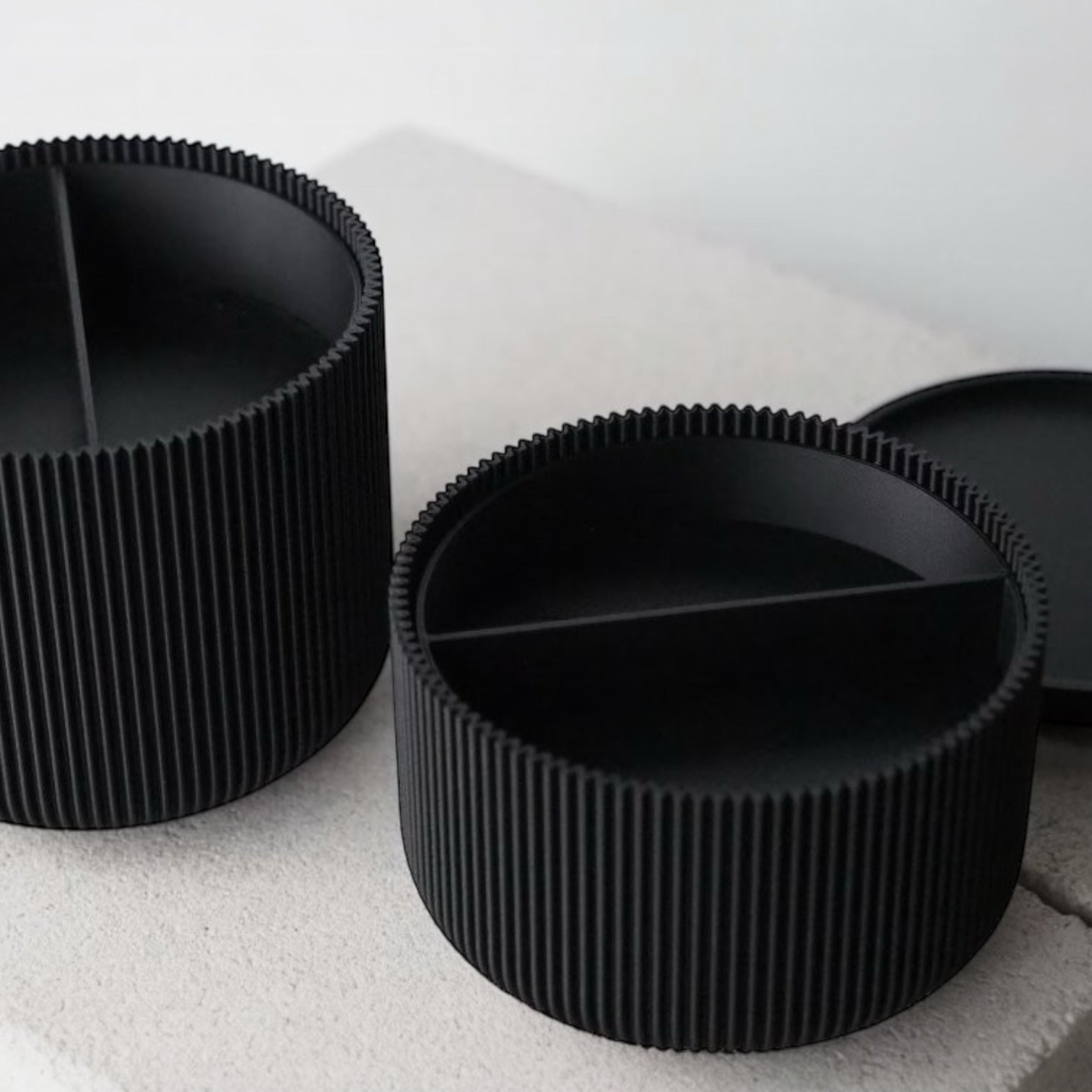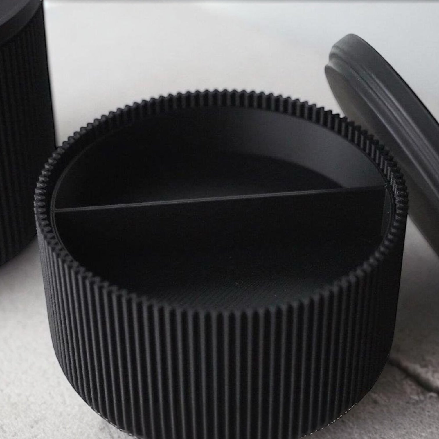 Die Dose wird mittels 3D-Druck präzise hergestellt, während der Deckel aus Jesmonite gegossen wird. Die glatte Oberfläche des Deckels bildet einen schönen Kontrast zur geriffelten Oberfläche der Dose.