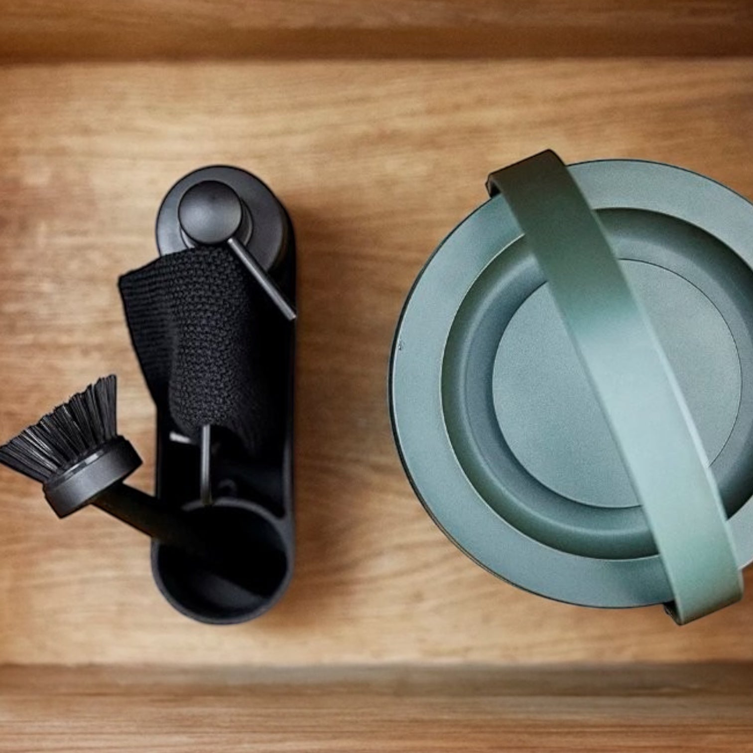 Der Raum in der Mitte des Spülsets kann beispielsweise einen Scheuerschwamm und ein Tuch aufnehmen, während die Metallbügel sowohl als praktischer Griff als auch als hervorragendes Trockengestell für das Tuch dienen.